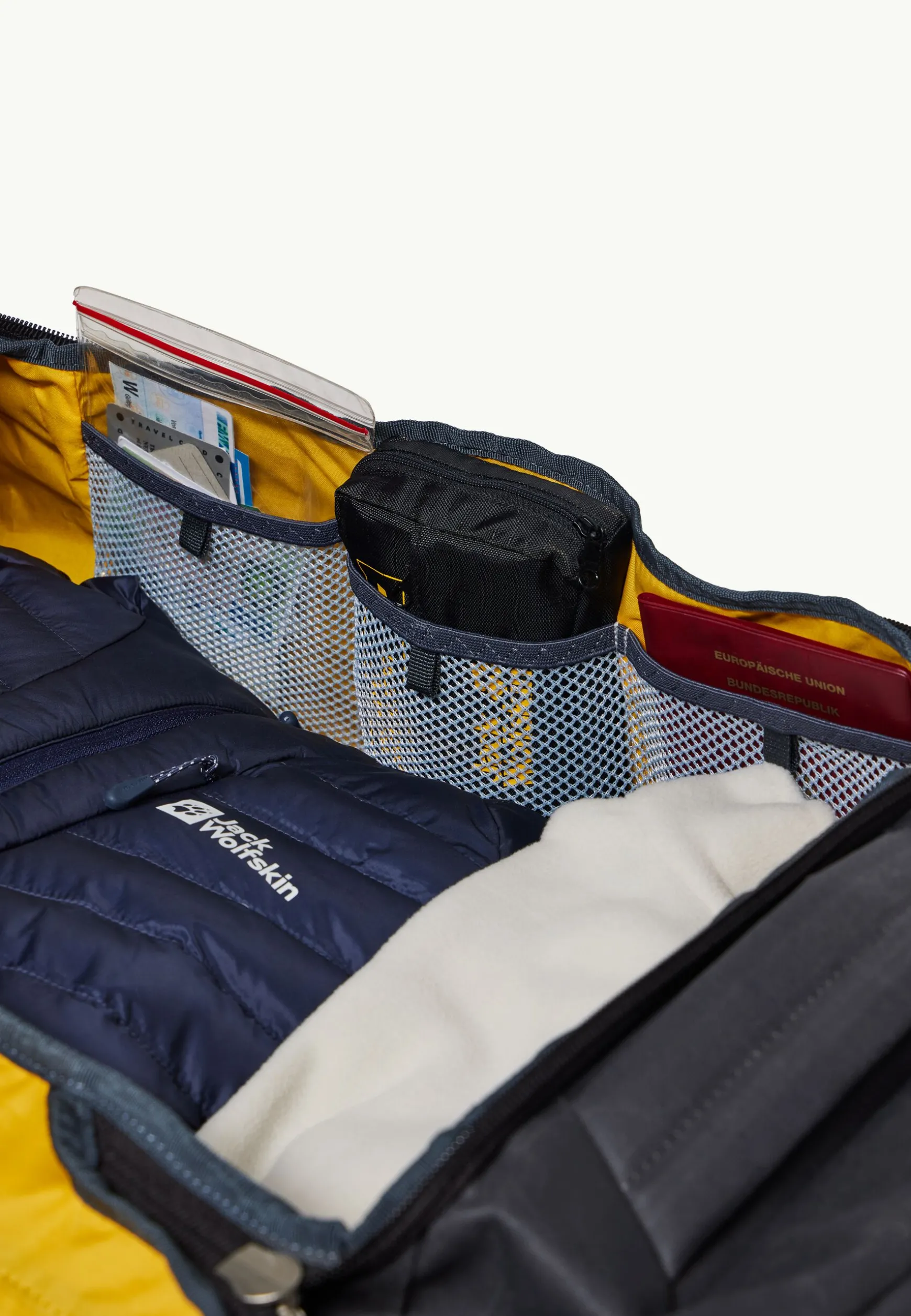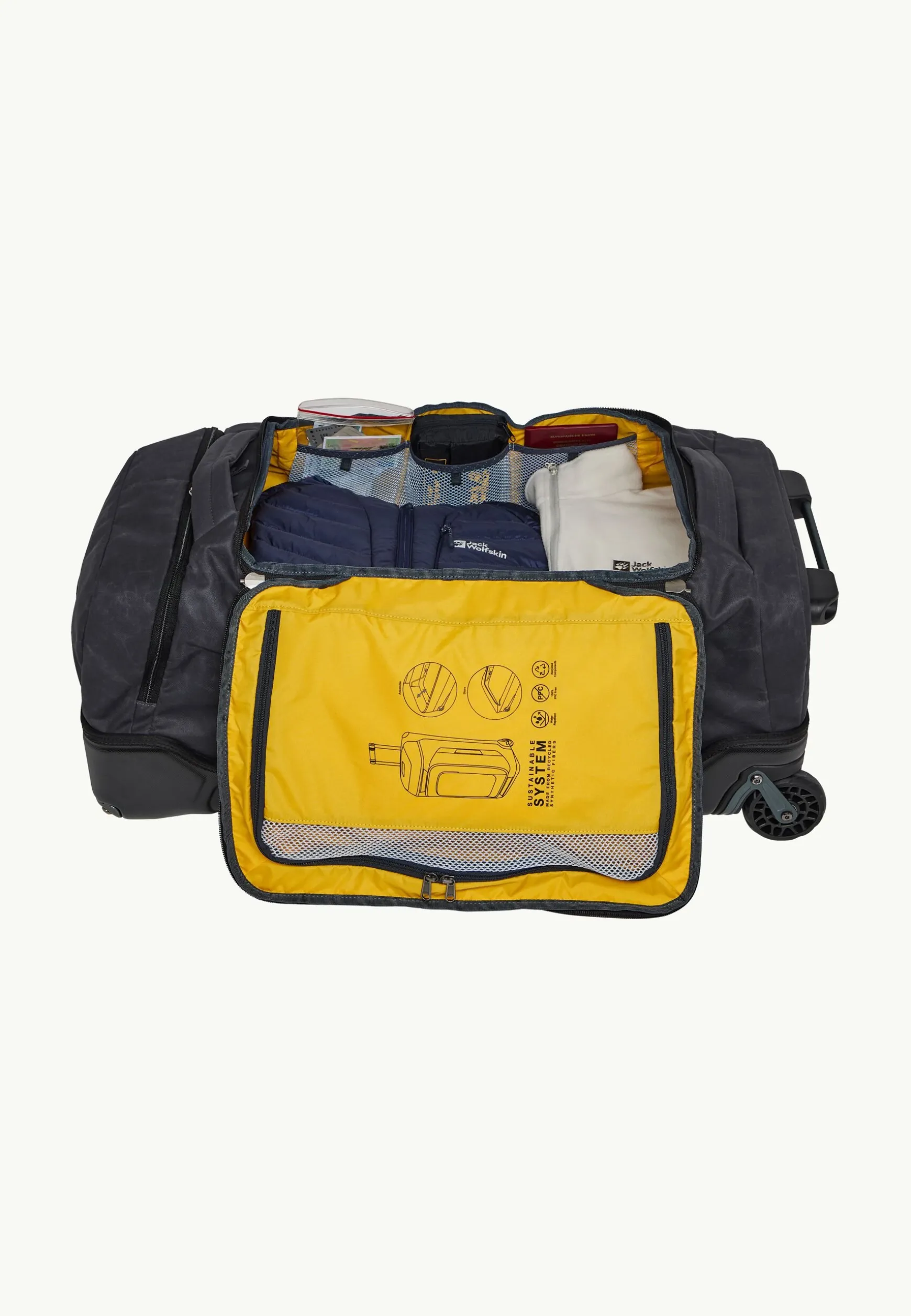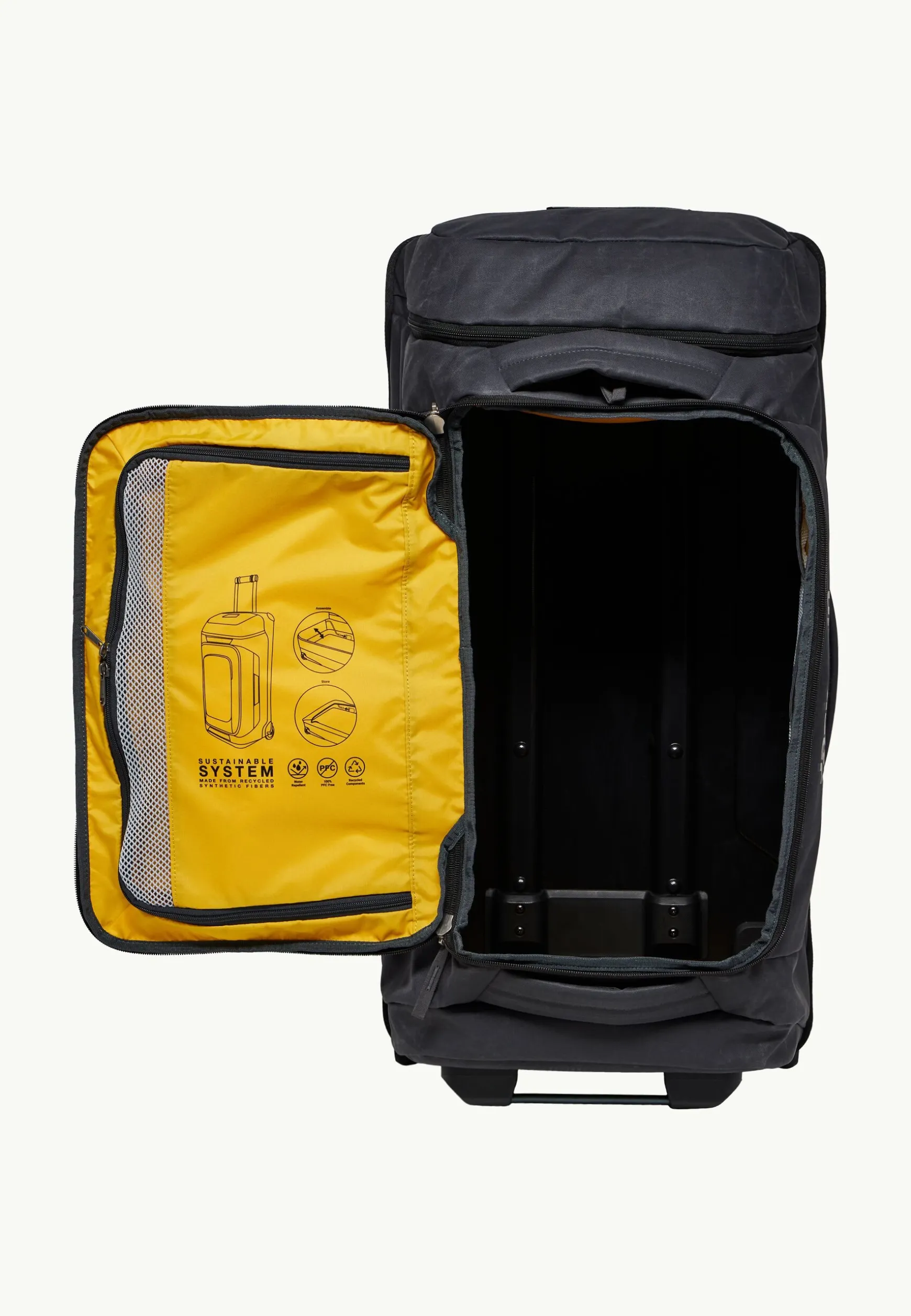 Der strapazierfähige TRAVELTOPIA WHEELER 80-Trolley ist auf jeder Reise der perfekte Begleiter. Er besteht aus wasserabweisendem WAX WEAVE 600D-Material und ist durch den verstärkten Boden besonders widerstandsfähig. In dem Stauraum mit einem Fassungsvermögen von 80 Litern bringst du all deine Kleidung und sperrige Gegenstände mühelos unter und kannst andere Kleinteile geordnet in den fünf Innentaschen aufbewahren.