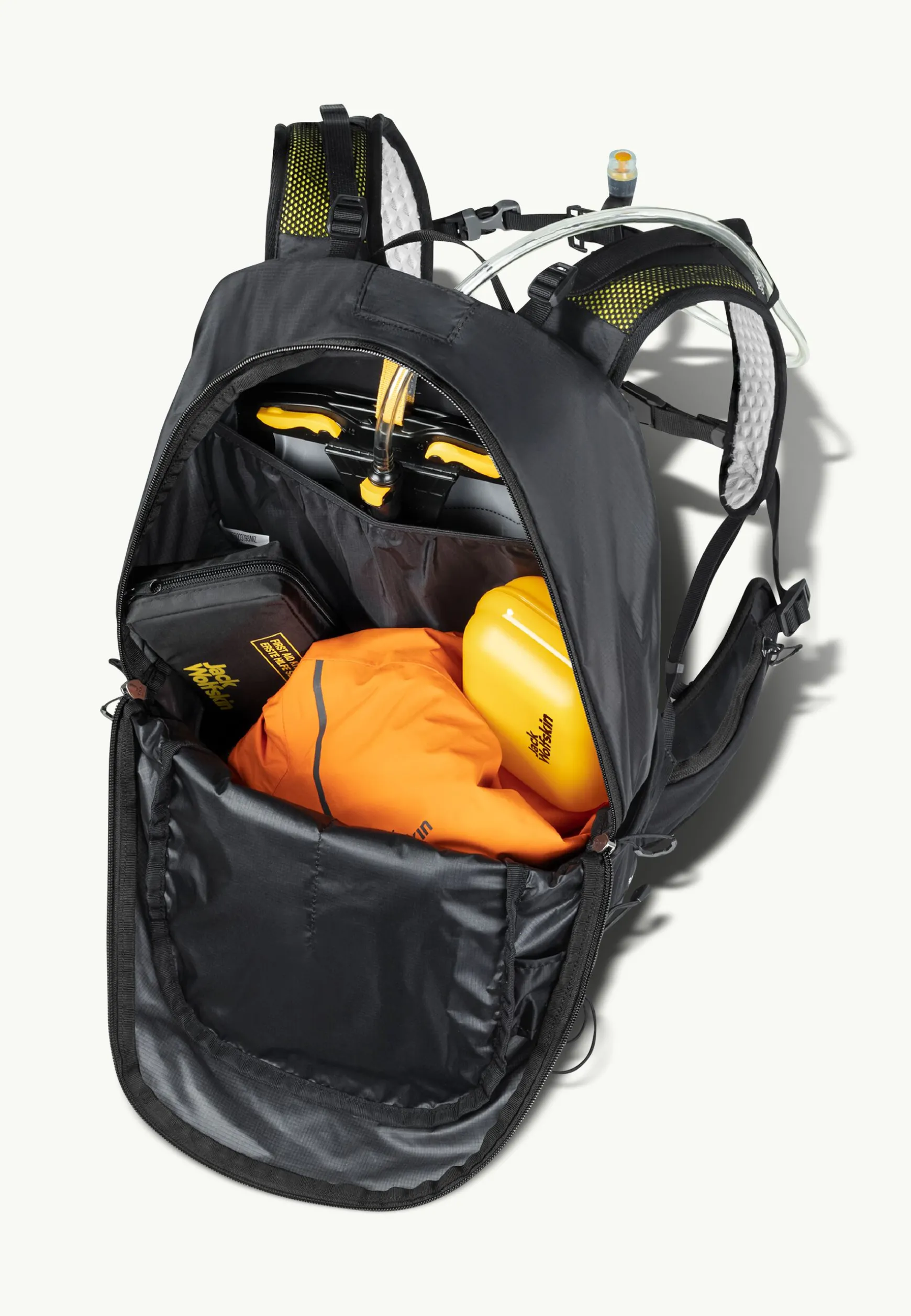 Das Innenfach im geräumigen Hauptfach bietet Platz für eine Trinkblase. Eine separate Vortasche mit Einschubfächern und ein praktisches Reißverschlussfach auf der Front bieten Stauraum für Kleinigkeiten. In den zwei elastischen Netzseitentaschen bekommst du große Trinkflaschen unter und kannst sie mit den seitlichen Kompressionsriemen fixieren.