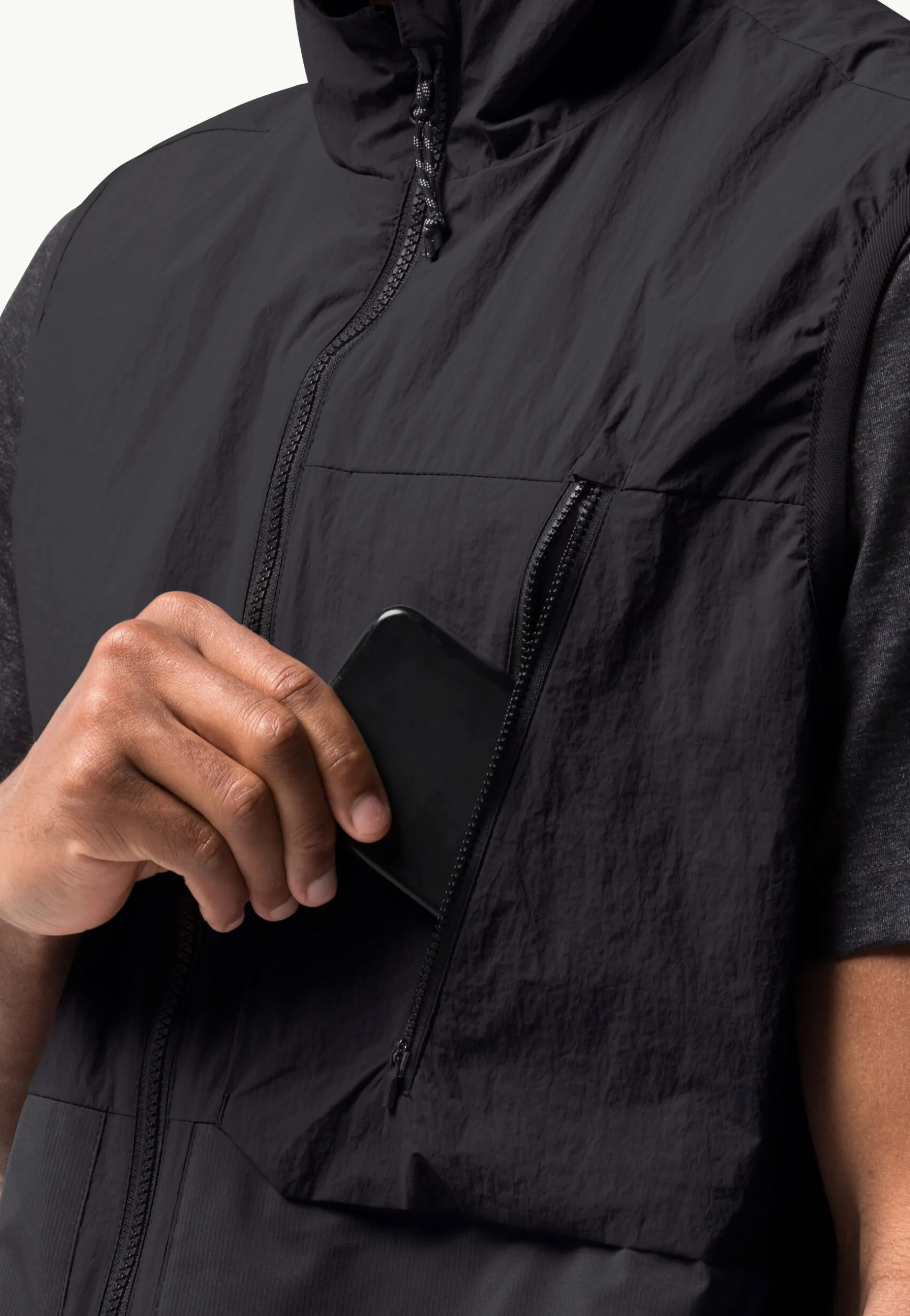 Die Brusttasche ist mit einem Reißverschluss versehen, sodass du Smartphone oder Portemonnaie sicher verstauen kannst.