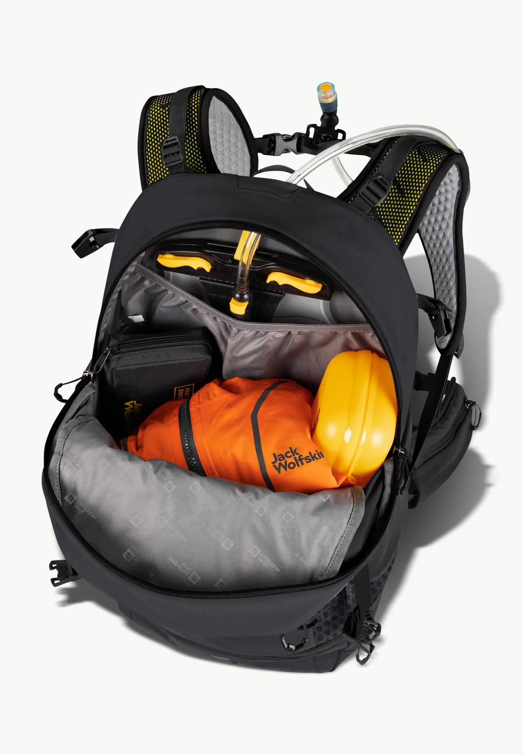 Der Rucksack bietet mit dem Bodenfach und dem geräumigen Hauptfach viel Stauraum, im Hauptfach ist außerdem Platz für die Trinkblase. Die Helmfixierung ist in einem separaten Fach auf der Front untergebracht.